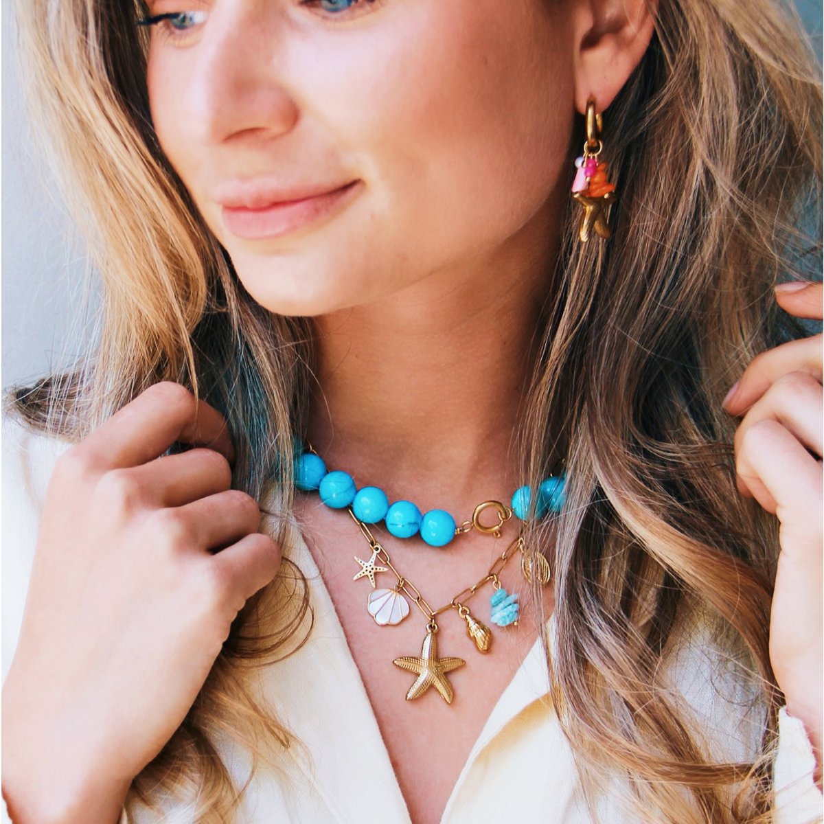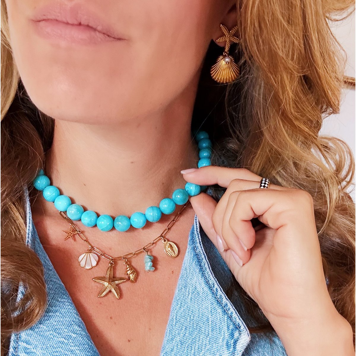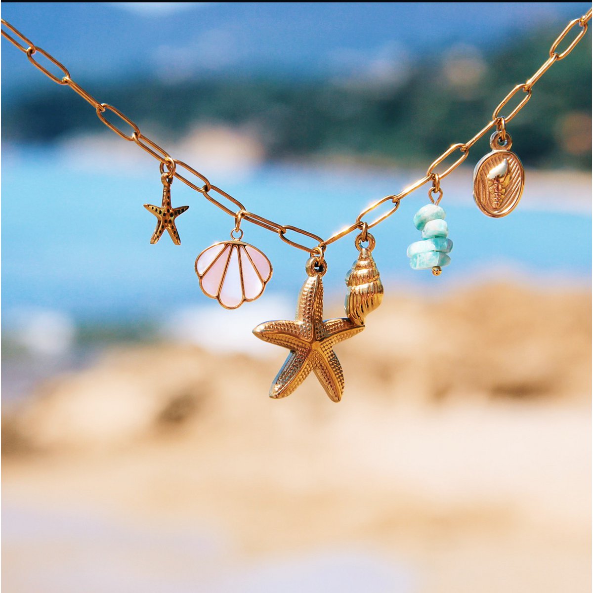 Entdecken Sie unsere Sea Treasure Collection und lassen Sie sich vom Sommerschmuck an den ersten Geschmack endloser, sorgloser Tage im Meer erinnern. Diese Halskette ist wirklich ein Muss, das Sie zu Ihrem Schmuckvorrat erweitern müssen, und vervollständigt jeden Sommer-Outfit. Kombinieren Sie die Halskette mit schönen Ohrringen und Armbändern für eine verspielte Note. Sind Sie bereit zu bestellen? Bonnes Vacances!