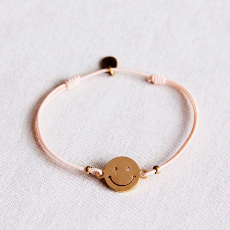 Das elastische Armband in der Farbe Pfirsich ist mit einem fröhlichen Smiley versehen. Das Armband ist individuell verstellbar.