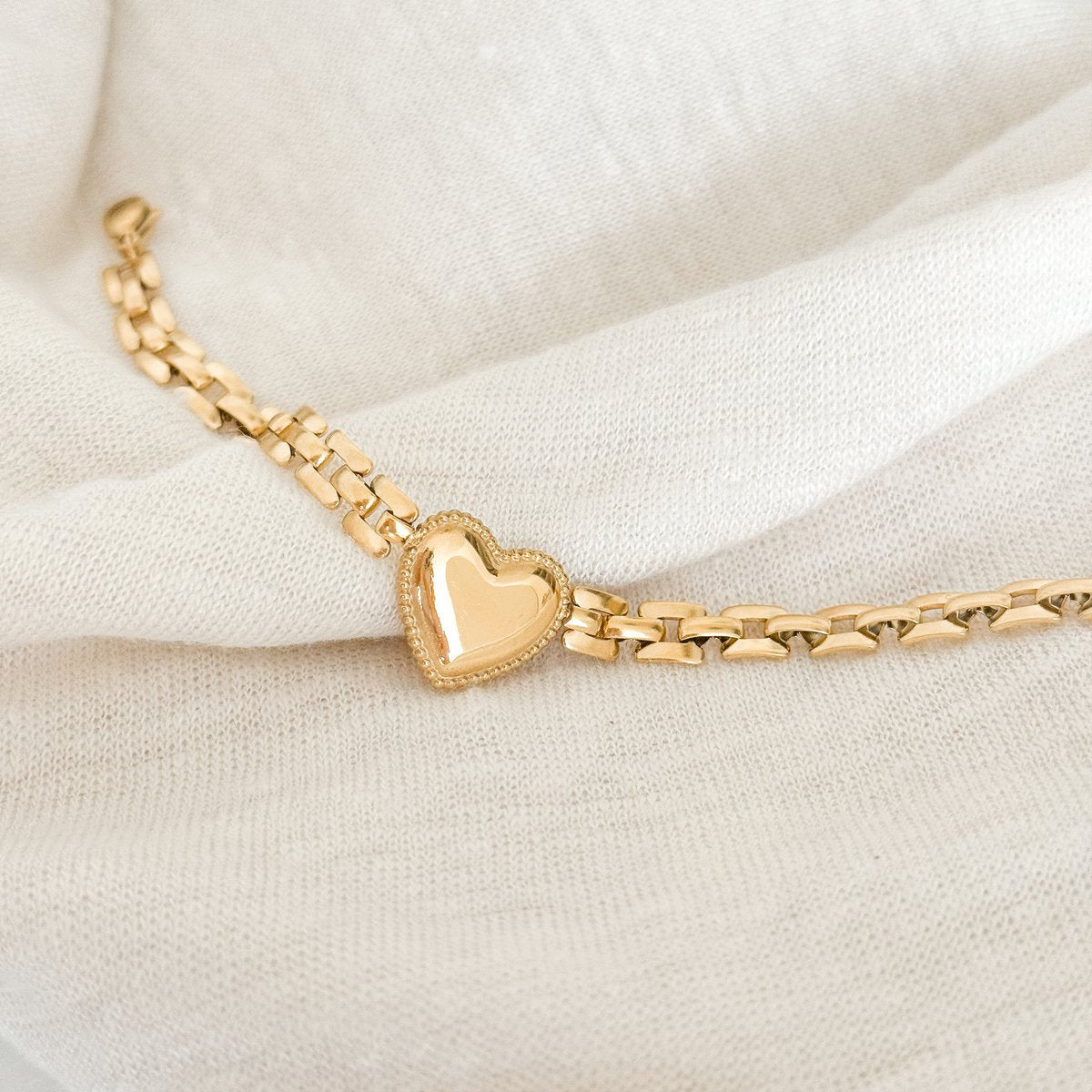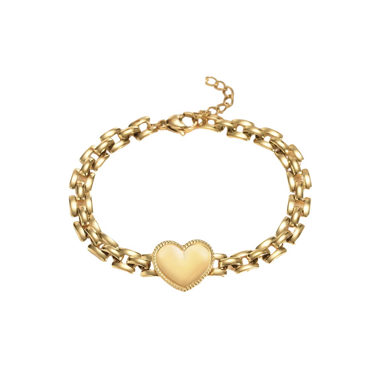 Dieses Armband erregt sofort die Aufmerksamkeit mit seinen breiten Verbindungen, die im Licht wunderschön leuchten. Das Herz in der Mitte ist mehr als nur ein Detail: Es ist das Schlagenzentrum dieses Statement-Stücks. Das glänzende Herz ist mit einer schönen Grenze umrahmt und verleiht ihm einen besonders luxuriösen Look.