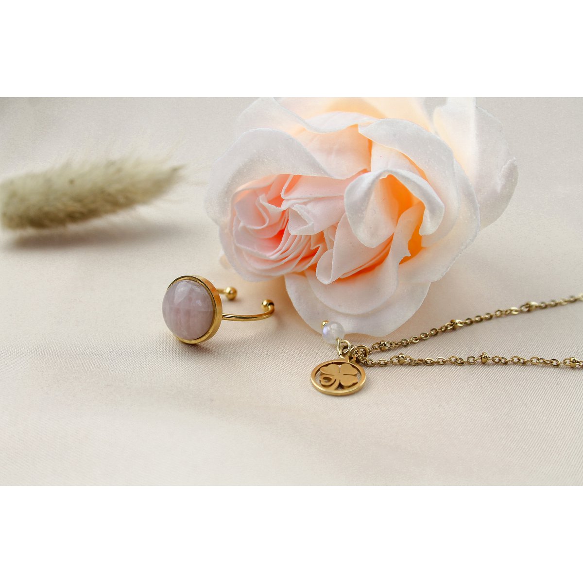 Halskette mit Kleeblatt & Mondstein - Gold
